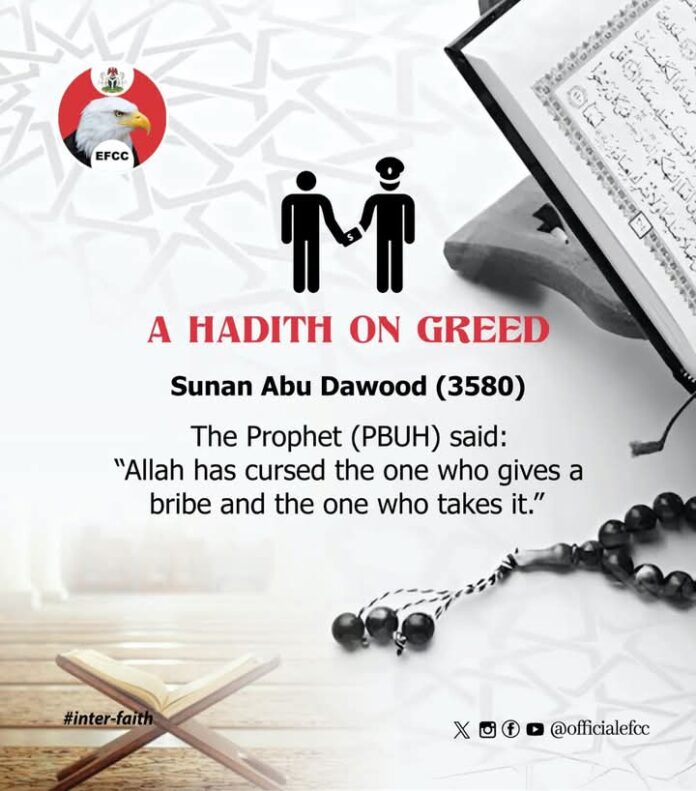 EFCC ta ambaci wani hadisi daga cikin Sahih Hadith ɗin Abu Dawud mai lamba ta 3580, inda Manzon Allah (S.A.W) ya ce: “Allah ya la’anci mai bayar da cin hanci da wanda aka baiwa.”